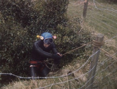 Phil Firth climbs out of the one hundred feet deep shaft after the dive. Investigation of this type is not as a rule practiced by the group but owing to the fact that this was a straight descent through clear water, it had been considered safe. A camera for this type of work is currently under construction.