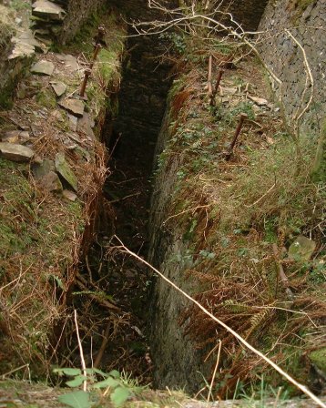 Beckwiths wheel pit. Originally located at Clucas's mine or Bell Hole in Foxdale, the forty foot wheel was disassembled and moved to Beckwihs mine in 1838 to pump from a small shaft a short distance up from the wheel. Water became a problem in the dry season and sinking the shaft was frequently hindered. The large bolts held the heavy timbers in place for the bearings.